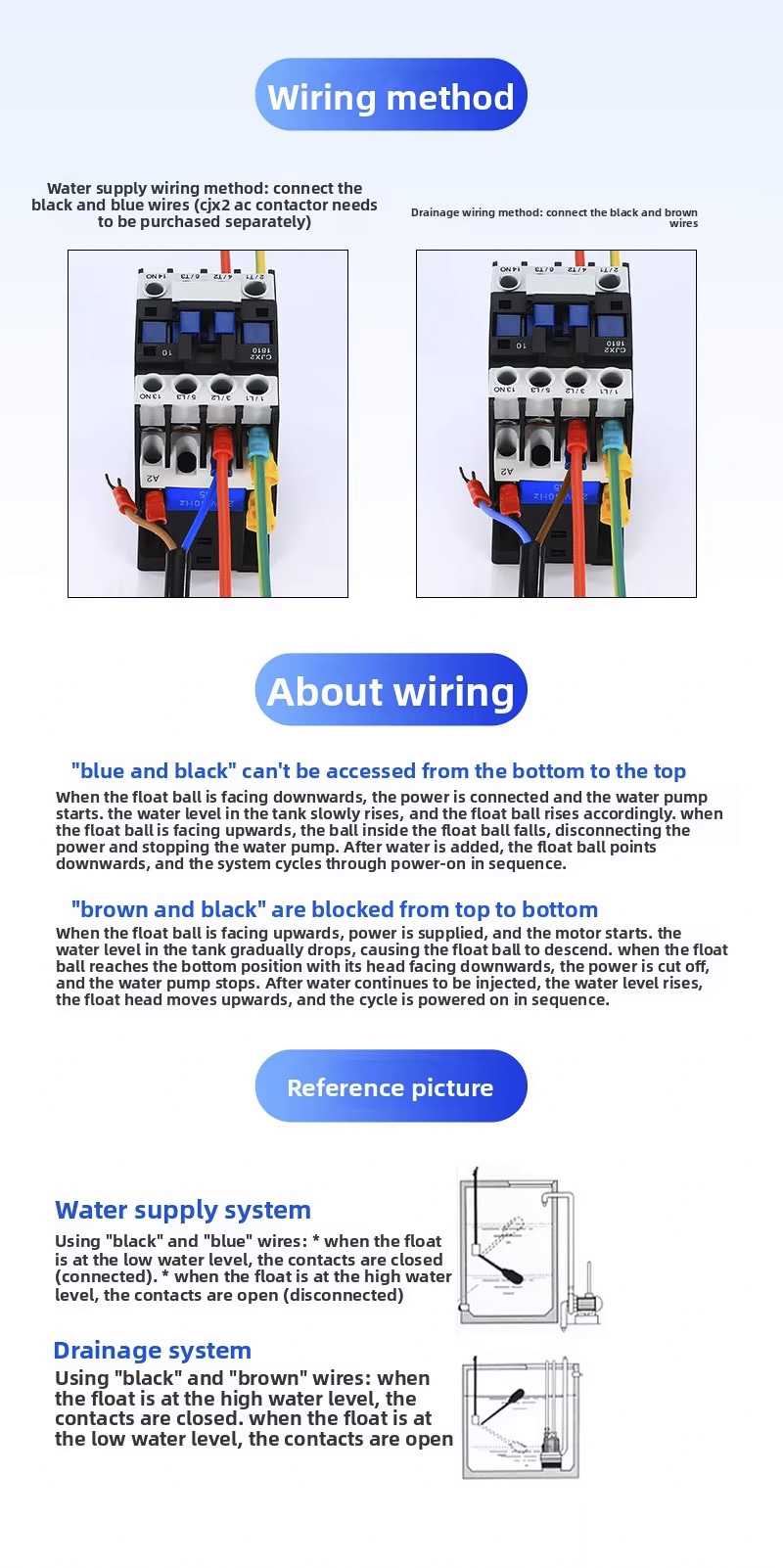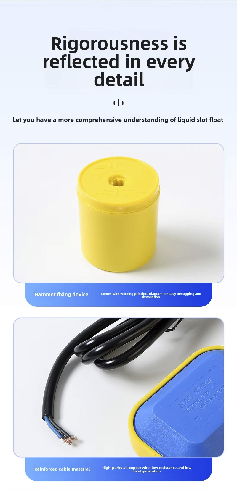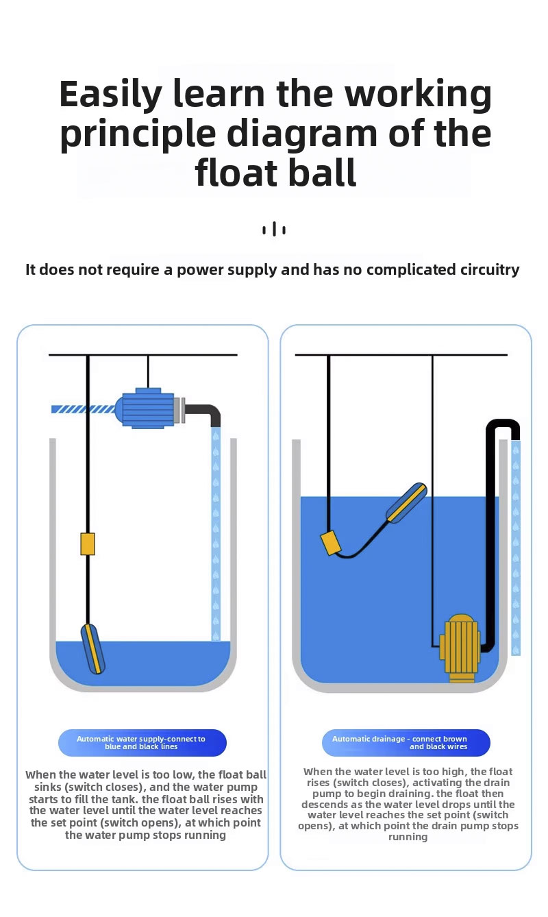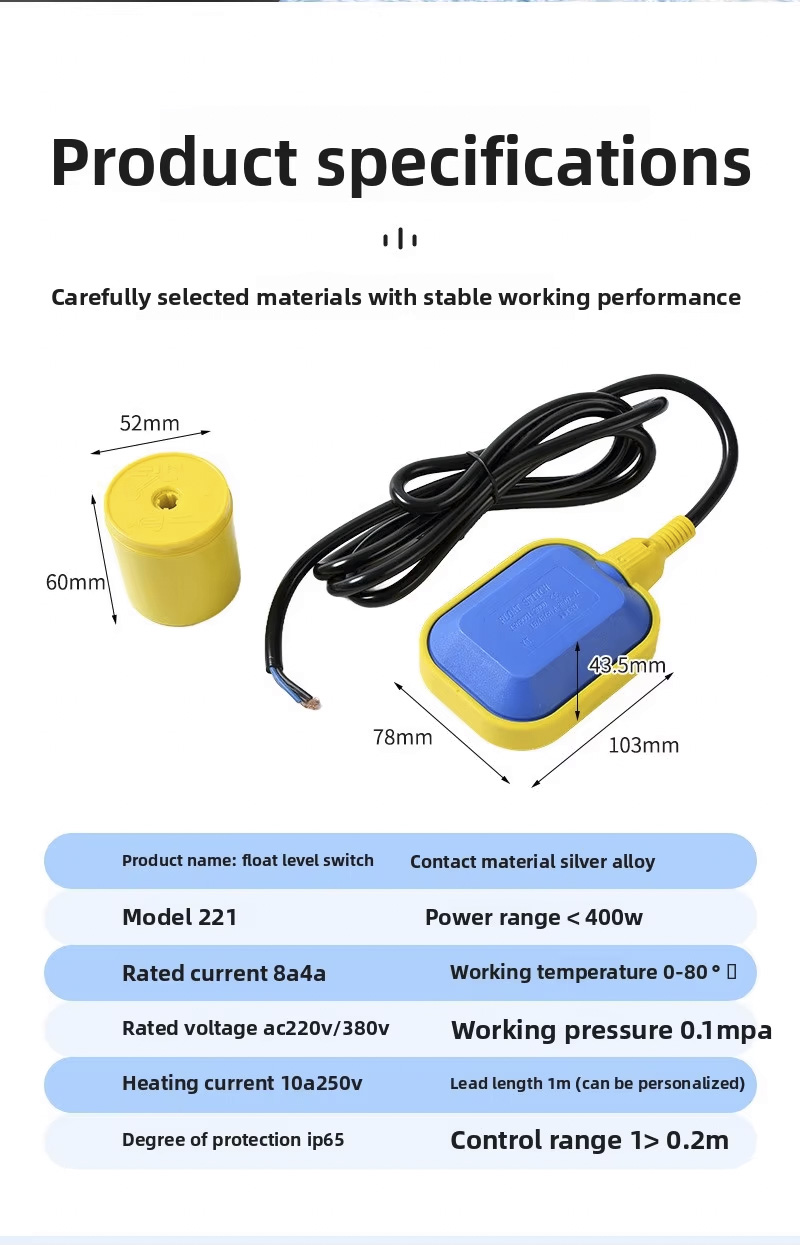 Цей поплавковий вимикач має велику круглу конструкцію з 2 м, 3 м, 5 м, 10 м, ступенем захисту IP68 і працює при температурах від 0 ℃ до 80 ℃, підтримує широкий діапазон напруги від 110 В до 220 В і має надійний робочий тиск ± 0,5 МПа. Продукт можна налаштувати за допомогою лазерного гравіювання, тиснення логотипи або послуги OEM/ODM, що забезпечує адаптивність для різноманітних застосувань.