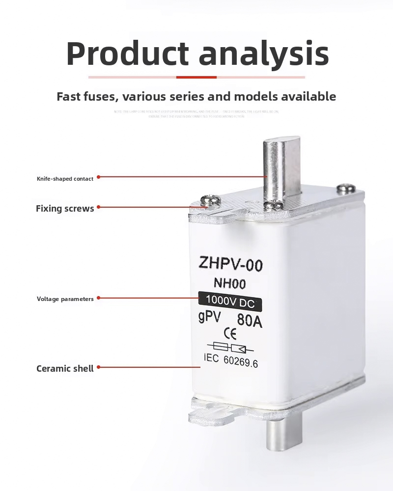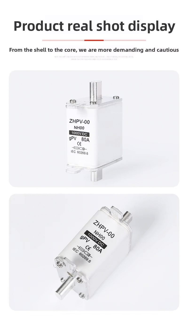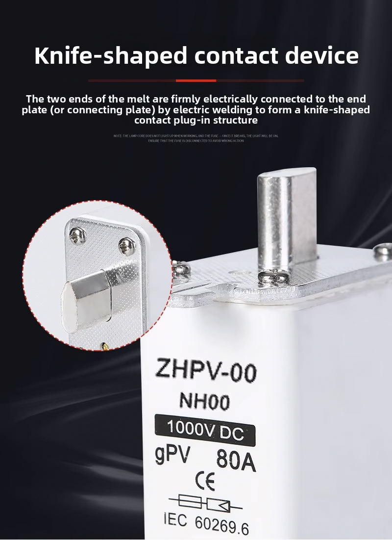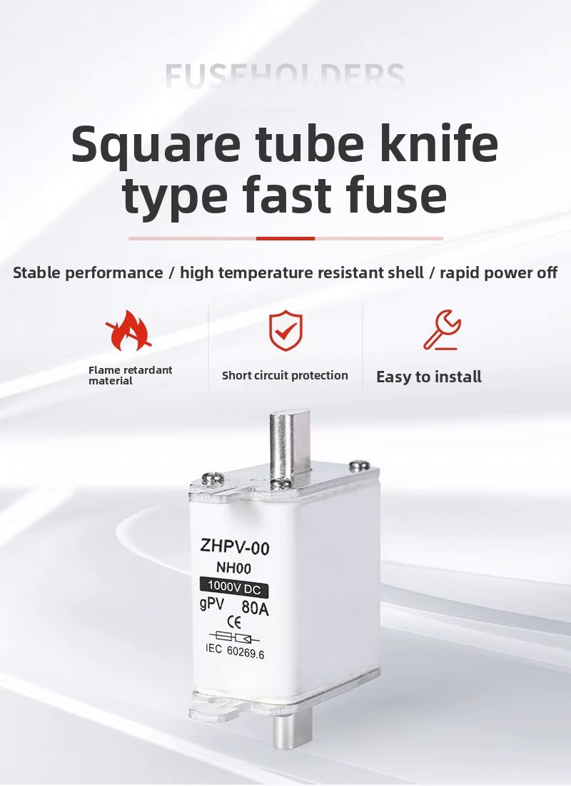 NH00-1000V IEC Низьковольтний фотоелектричний ножовий запобіжник Пластиковий 80A 6ka Розривна здатність призначений для ефективного та надійного захисту ланцюгів у фотоелектричних системах та інших системах низької напруги. Цей високоякісний запобіжник працює до 1000 В, з надійною вимикаючою здатністю 6k, забезпечуючи безпечне відключення в разі перевантаження або короткого замикання. Його номінальний струм 80 А робить його придатним для різноманітних фотоелектричних установок і промислових панелей керування.