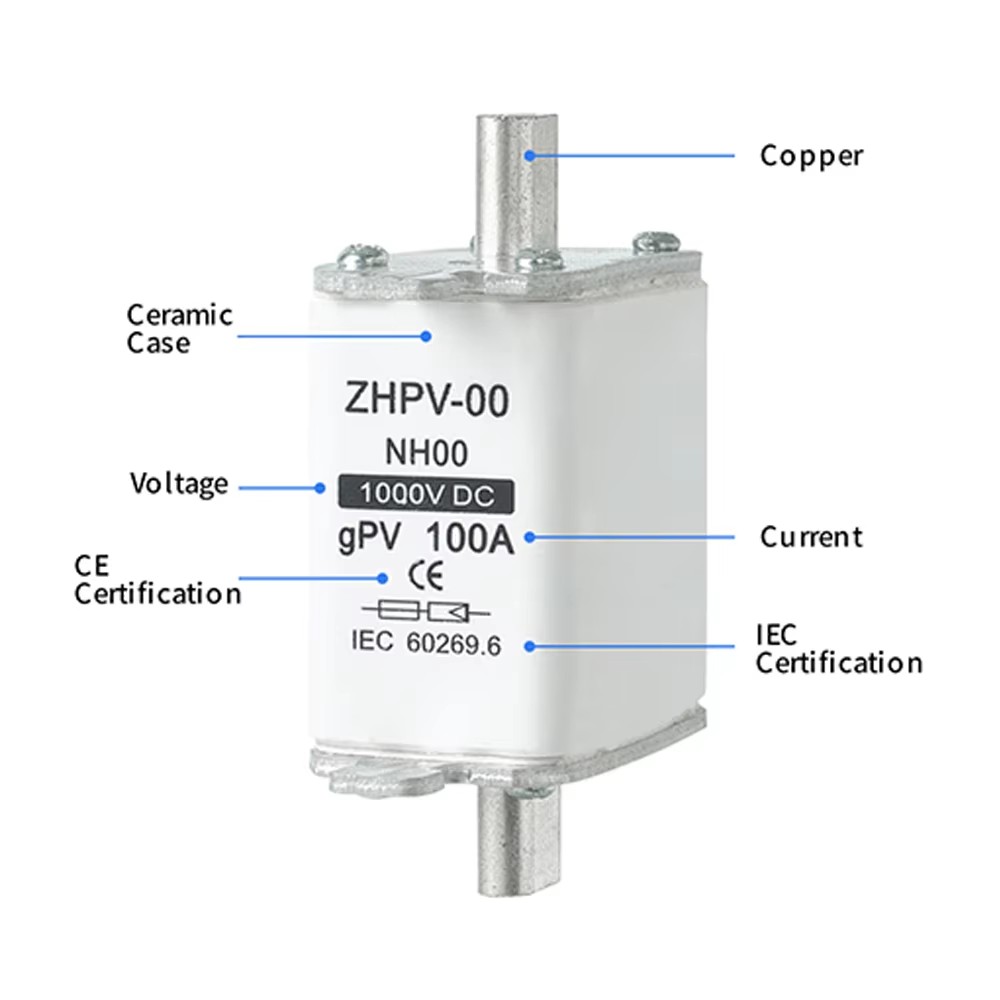 NH00 Фотоелектрична система DC 1000 В 32 ~ 100 A Плавка вставка Вибрано високоякісні матеріали для забезпечення стабільних і надійних характеристик запобіжника, швидкої реакції та високої безпеки. Компактний на вигляд, простий в установці, широко використовується в різних системах, таких як фотоелектричні об’єднувальні коробки, інвертори та розподільні шафи постійного струму. Фотоелектрична система NH00 DC 1000V 32~100A Fuse Link пройшла численні міжнародні сертифікації та відповідає стандартам IEC, що робить її ідеальним вибором для забезпечення безпечної роботи систем електростанції.