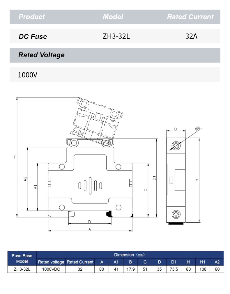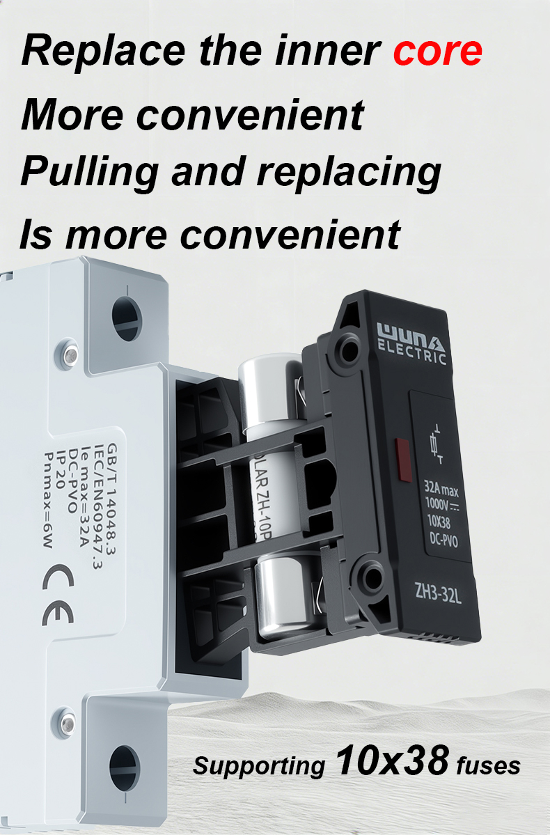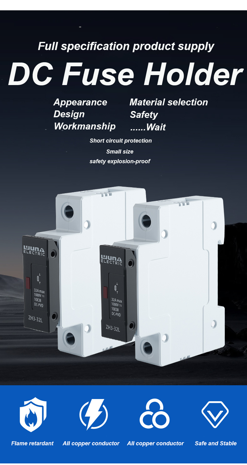Тримач запобіжника постійного струму ZH32L 1000 В — це високоефективний компонент, розроблений для забезпечення надійного захисту електричних ланцюгів у фотоелектричних та інших системах постійного струму. Тримач запобіжників ZH32L DC 1000V має міцну конструкцію та чудову ізоляцію та підходить для безпечного розміщення запобіжників на напругу до 1000V DC, ефективно запобігаючи пошкодженням від надмірного струму та короткого замикання.