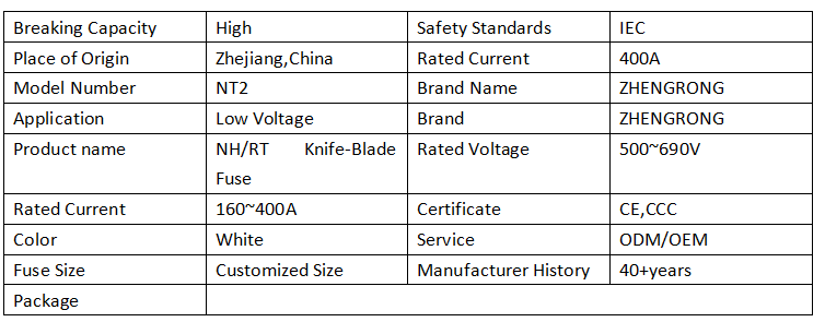 Квадратні керамічні запобіжники ZHENGRONG NT2 315A 500V зазвичай використовуються в промисловому електричному обладнанні, системах живлення та електронному обладнанні для захисту ланцюгів від перевантажень і коротких замикань.