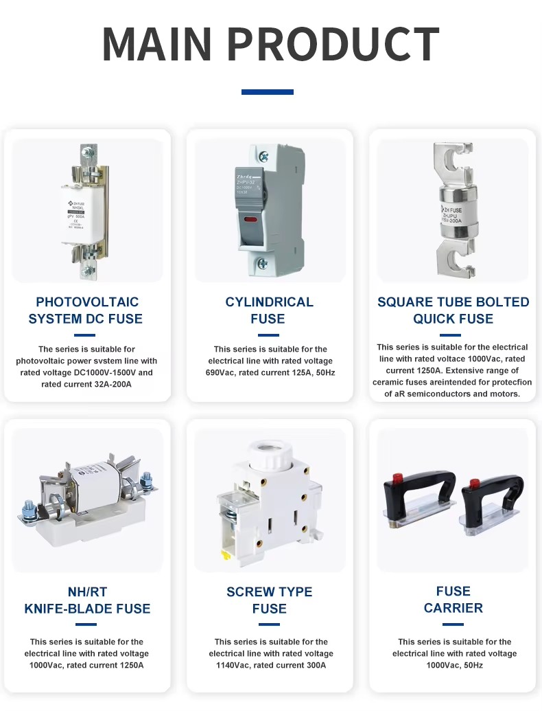 Структурні характеристики запобіжної основи ZHPV-125 1000V постійного струму та запобіжників 22 × 58 мм циліндричне керамічне запобіжник у фотоелектричній системі наступні. Ця серія запобіжників складається з запобіжника та власника запобіжника. Змінний корпус запобіжника поперечного перерізу, виготовлений з чистого мідного листа (або мідного дроту, срібного дроту, срібного листа), запечатано в трубці з запобіжником, виготовленої з високоміцної керамічної або епоксидної скляної тканинної трубки, наповненої хімічно обробленим кварцовим піском з високою чистотою як гасіння дугового гасіння. Дві сторони сердечника запобіжника надійно з'єднані з кінцевою пластиною через пляму зварювання, утворюючи циліндричну структуру у формі кришки. Основа запобіжника ZHPV-125 1000V постійного струму виготовлена з смоли або пластикової оболонки, натиснутою електричним ударом, включаючи елемент запобіжника, який з'єднаний за допомогою клепки як підтримки відповідного компонента корпусу запобіжника. Ця серія запобіжників має переваги невеликого обсягу, легкої установки, безпечного використання та прекрасного зовнішнього вигляду.